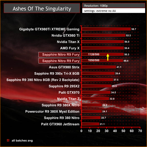 This is really no indication of how the final Direct X 12 game will run, however we can see the R9 Fury is outperforming the overclocked GTX980 Strix, by a significant margin.