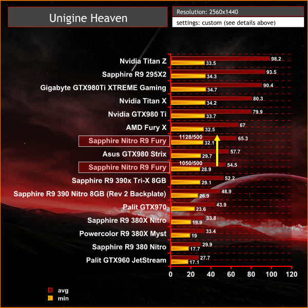 Again we can see the performance level follows a similar pattern as before with the Fury being slightly outperformed by the overclocked Asus GTX980 Strix — but when clocked to the limit it manages to trade places.