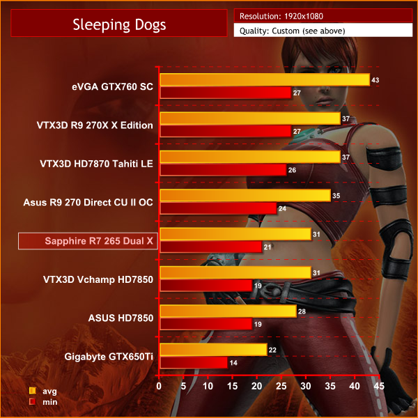 The Sapphire R7 265 card matches the VTX3D VChamp HD7850 in average frames per second, although it holds a slightly better minimum frame rate.