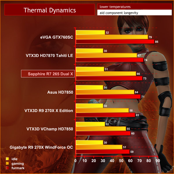 The Dual X cooler performs well, holding gaming load temperatures at 66c in our specific environment.