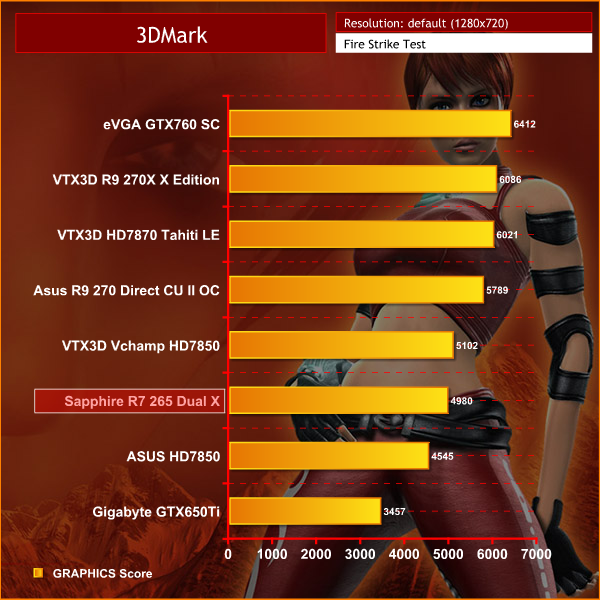 The graphics score of around 5,000 points is close to the overclocked HD7850 which we reviewed in depth last year.
