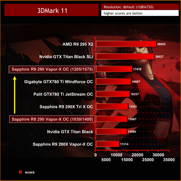 This manual increase pushed the Sapphire R9 290 Vapor-X OC to a final score of 17,418 points. In real world terms this pushes it ahead of the overclocked Gigabyte GTX780 Ti Windforce OC!