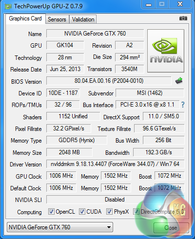 The MSI GTX760 Gaming Mini ITX is built on the 28nm process. It has 32 ROP's, 96 texture units and 1,152 Cuda Cores. The 2GB of GDDR5 memory is connected via a 256 bit interface it is clocked at 1,500mhz (6Gbps effective). The core clock speed has been increased to 1,006mhz with a boost to 1,072mhz.