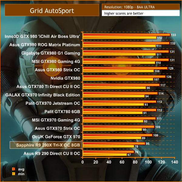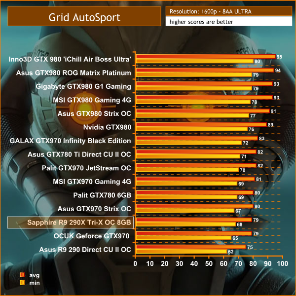 The Sapphire R9 290X Tri-X OC 8GB delivers a rather poor result at 1080p, way behind the reference clocked GTX970. Scaling at 1600p is better, managing to outperform the reference GTX970, and very closely matched against the Asus GTX970 Strix OC.