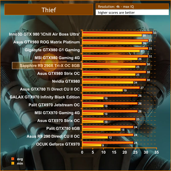 This is more like it, the Sapphire R9 290X Tri-X OC 8GB scores well at 4K – head to head against the overclocked GTX980 cards … averaging 30 frames per second and never dropping below 25 frames per second.