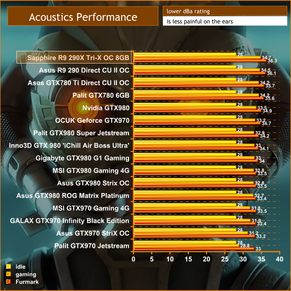 None of the cards in this test are what we would consider ‘loud'. Due to AMD architecture and rather high power demands the Sapphire cards have to deal with a lot more radiated heat. This causes the three fans to spin fairly fast under load on the Tri-X cooler.