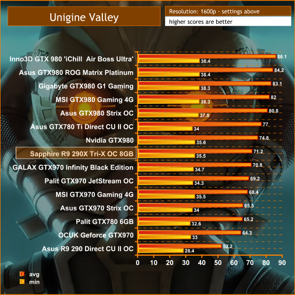 The Sapphire R9 290X Tri-X OC 8GB averages 71.2 frames per second, just ahead of the Galax GTX970 Infinity Black Edition.