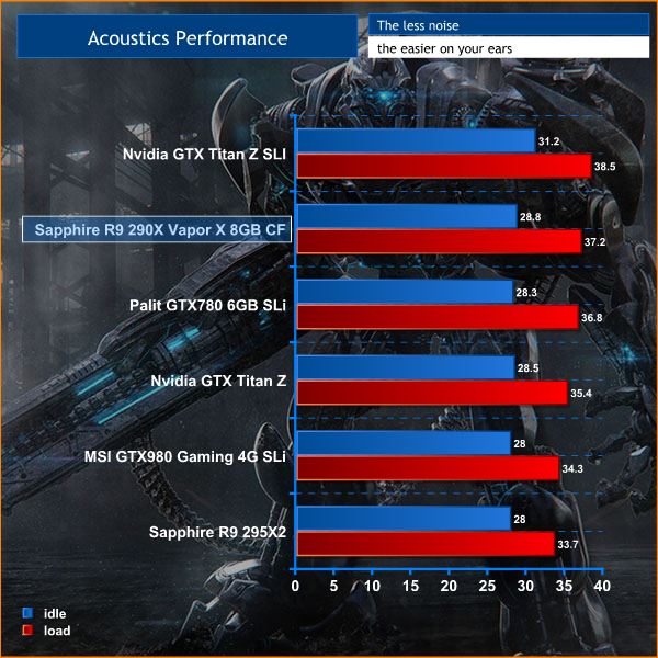 The quietest solution is the Sapphire R9 295X2 which is watercooled. Nvidia really should have thought about this for the Titan Z, especially as they could have cranked the core clock speeds in excess of 900mhz, and perhaps even up to 1GHZ. This would have had a huge, positive impact on overall performance.