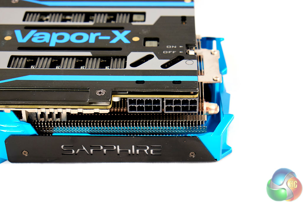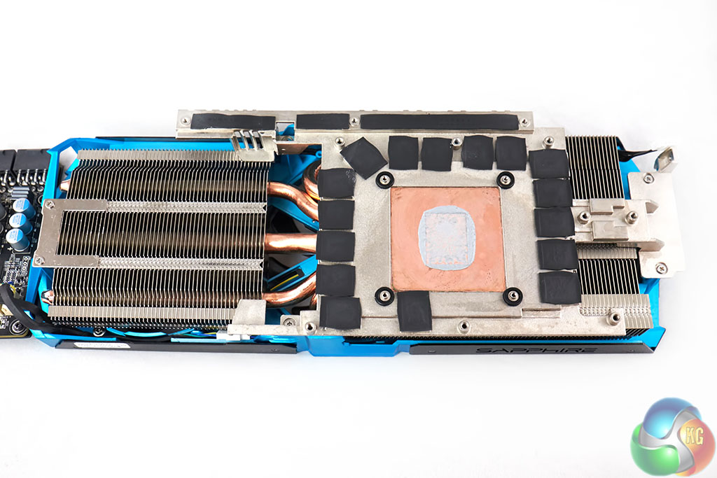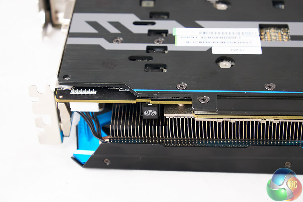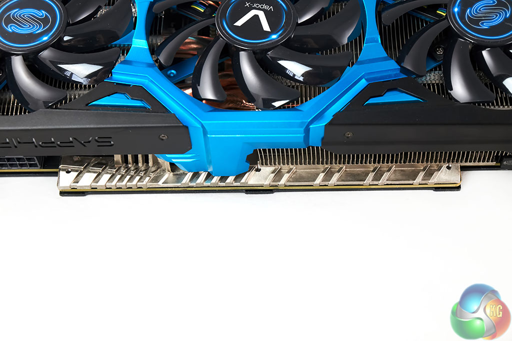 You may have seen the white strip running along the top of the card, close to the two 8 pin power connectors. Sapphire’s engineering team have left one of the copper layers exposed. An additional heatsink mounted direct to the copper layer means that heat can be absorbed into the PCB from the GPU, then transferred out. Sapphire claim a reduction in overall temperature by ‘several degrees’.