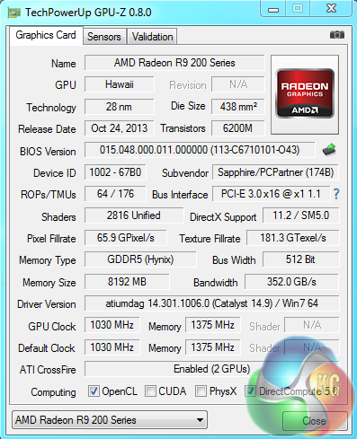 The Sapphire R9 290X Vapor X 8GB is built on the 28nm process and we can see the Bios date is set at Oct 24th, 2013. The Hawaii core is overclocked to 1,030mhz, and the 8GB of GDDR5 memory is connected via a wide 512bit interface, running at 1,375mhz (5.5Gbps effective). There are 64 ROPs, 176 Texture units and 2816 Stream processors onboard.