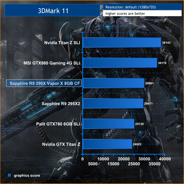 The two Nvidia Titan Z cards claim top position, scoring 38,143 points. The MSI GTX980 Gaming 4G cards in SLi take second place, scoring 36,170 points. The Sapphire R9 290X Vapor X cards in Crossfire score almost 30,000 points, taking third place. The Palit GTX780 6GB cards in SLI score much less, at 25,120 points.