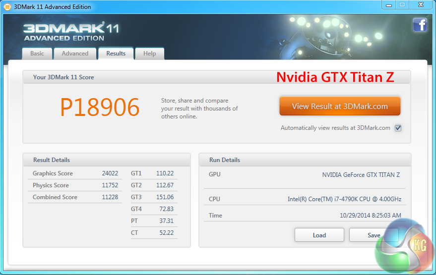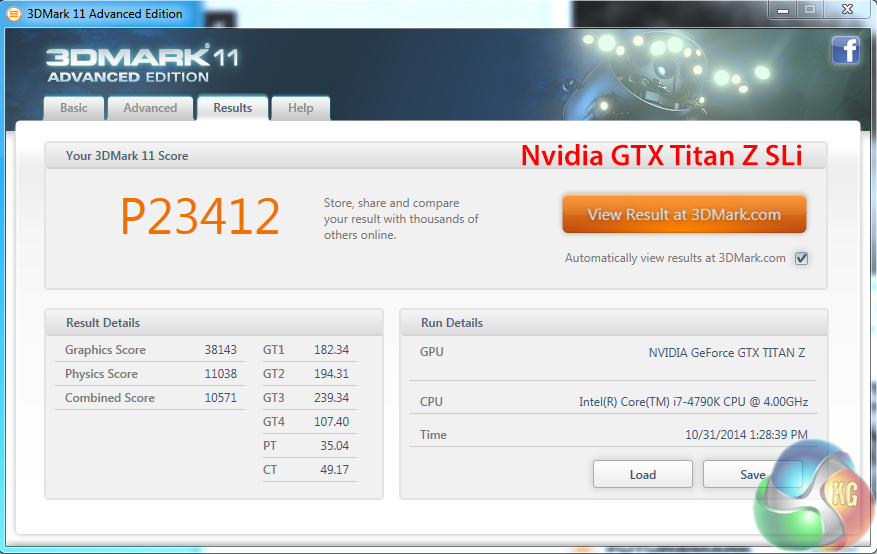 The single Titan Z is bottom of our chart, scoring 24,022 points. Both of the GPU cores are clocked very modestly at 706mhz, which impacts performance.