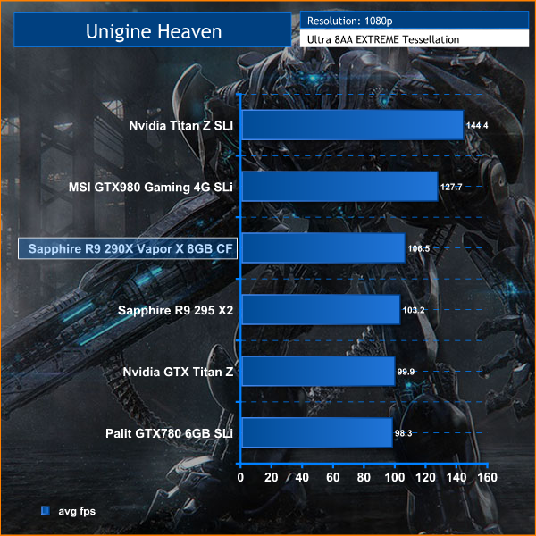 The Sapphire R9 290X Vapor X 8GB cards hold an average of 106.5 frames per second, placing them around 21 frames behind the MSI GTX980 Gaming 4G SLi configuration. The dual Titan Z graphics cards hold an average of 144.4 frames per second with the single card holding a 100 frame per second average.