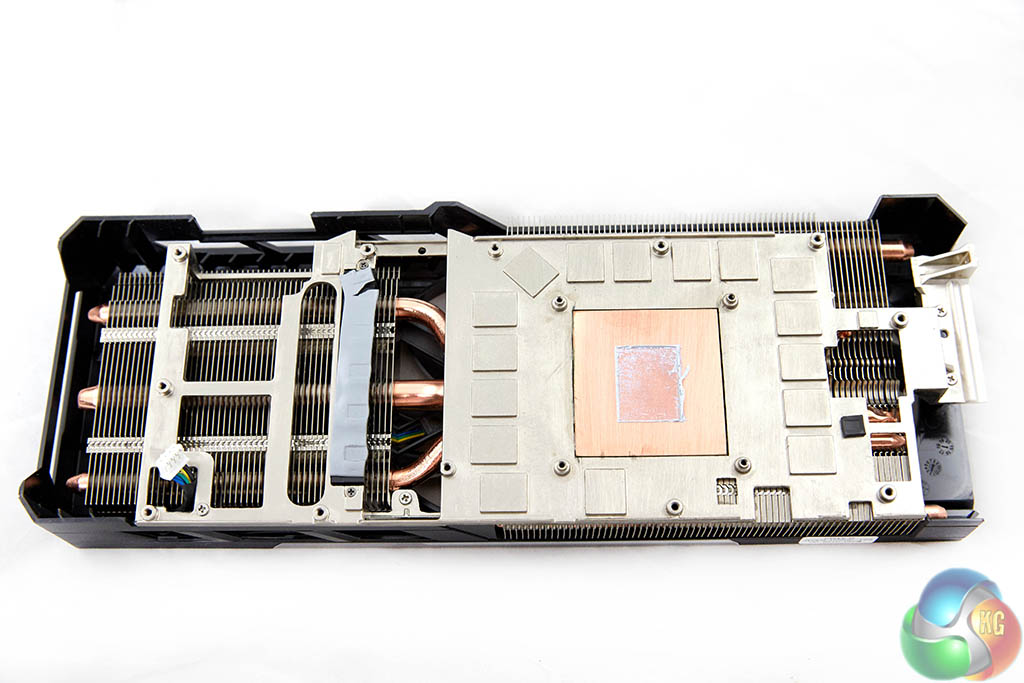 We can see the GDDR5 memory is directly cooled from the heatsink above. 10mm heatpipes expel heat from the copper heatpipe, across a large rack of aluminum fins which span the full width of the PCB. The diecast heatsink bolts into the PCB to help improve rigidity. Sapphire equip the card with their Diamond Black chokes to help improve stability and longevity.