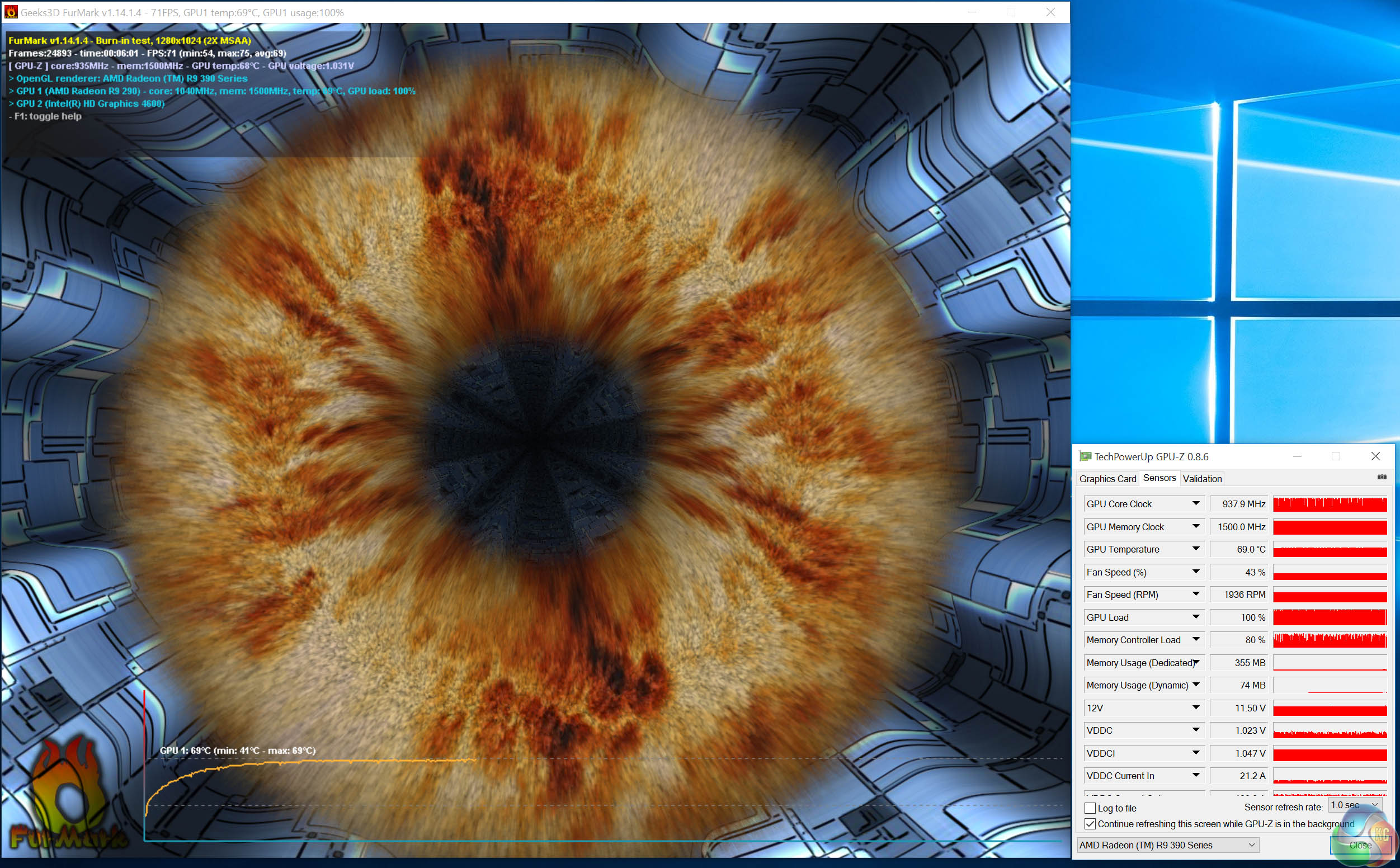 The image directly above is the original thermal image from the first revision Sapphire R9 390 Nitro 8GB (without backplate) which we tested back in July this year. If you ever needed to see the difference a backplate can make, this is a good indication. Almost 30c difference under extended load.
