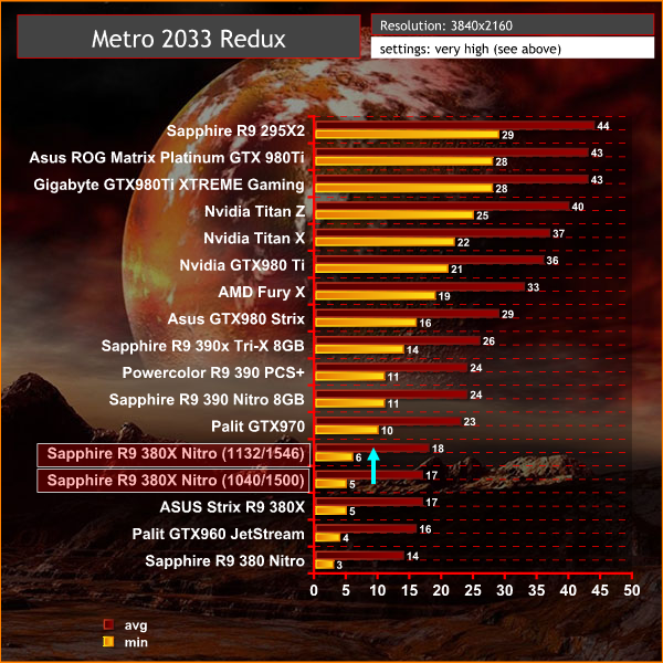 Metro 2033 Redux is a remake of the original game, with enhanced graphics. We often test with Metro Last Light Redux, but decided to mix things around for this review today. We test at 2560×1440 with the following settings: Quality-Very High, SSAA-off, Texture Filtering-16x, Motion Blur-Normal, Tessellation-Normal, Advanced Physx-off.
