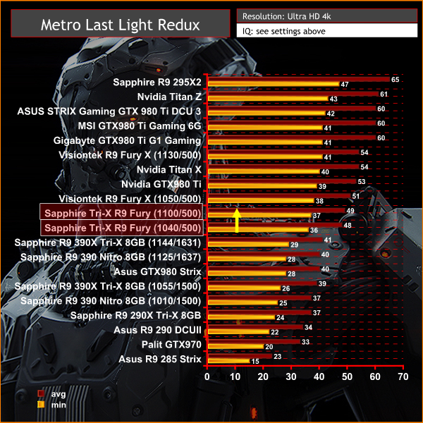A great set of results at Ultra HD 4K, and we can see how the new AMD architecture manages to pull away from the GTX980 at the highest resolutions. The Fury X delivers superb results at these settings with this engine, and the Fury can't quite catch up, even when manually overclocked.