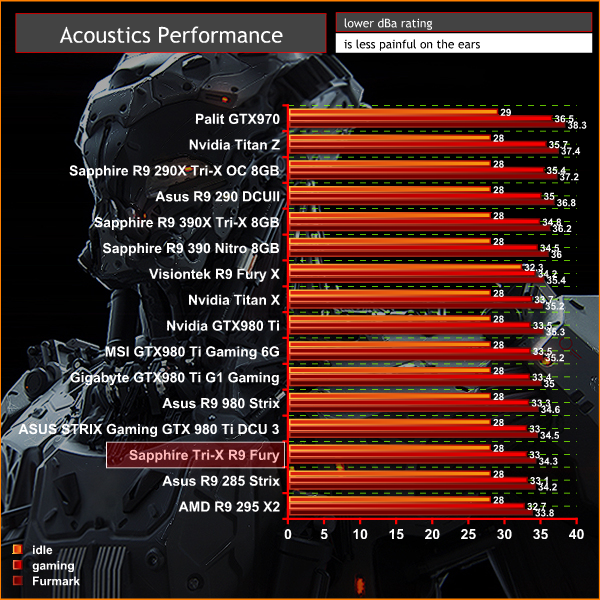 The Sapphire Tri-X R9 Fury is an exceptionally quiet graphics card. Under idle or low load conditions the fans disable completely and the card is silent (our equipment is limited to an accurate minimum reading of 28dBa). Under load the card measures 33 dBa which is very quiet indeed. A single case fan would likely drown out the fans on the Sapphire card completely.