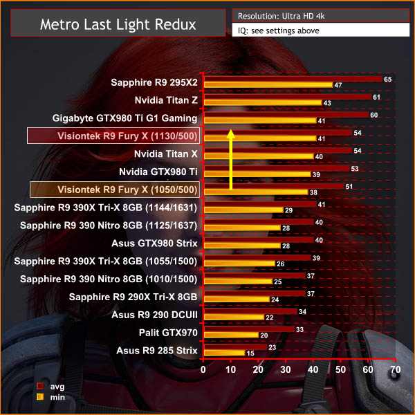 We have pointed out the R9 Fury X card's minimum frame rate numbers and how they closely tie in with minimum FreeSync operating ranges of common 1440P monitors (using our image quality settings). Metro Last Light Redux extends that point to 4K – the R9 Fury X manages to post a minimum frame rate level of just over 40 FPS when overclocked, allowing it to run a typical 4K FreeSync monitor within the adaptive-syncing technology's operating range. No other single-GPU AMD card can manage something similar at these settings and resolution.