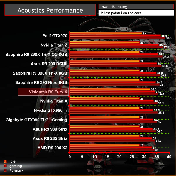 Unfortunately this actually negatively impacted the dBa readings above for the Fury X – as between idle and load, the fan on the radiator was very quiet. Most of the noise generated was actually from the pump, and associated coil whine. I got used to the pump noise after a few hours, but the coil whine was quite irritating.