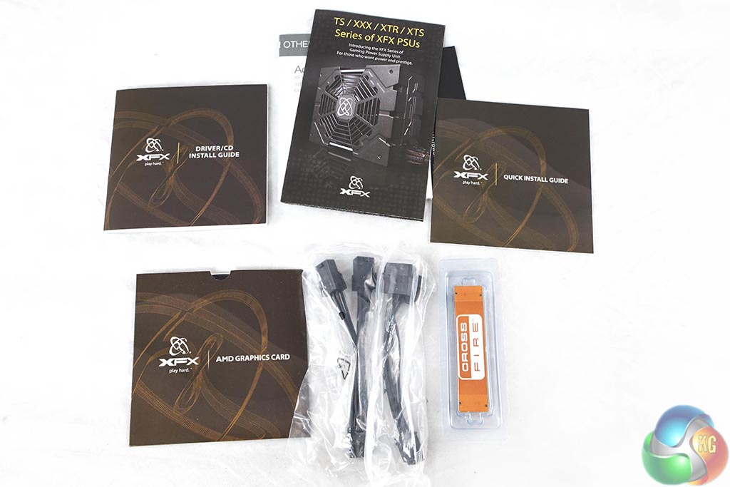 The bundle inside includes a Crossfire cable, some power converters and literature on the XFX range of power supplies. We advise you to install the newest drivers directly from the AMD website, rather than using potentially outdated drivers on a disc.