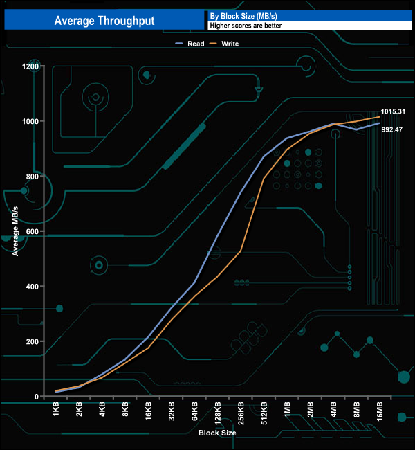 Cooler Master supplied our review sample Oracle Air bundled with a 1TB WD Blue SN570 which we used to test the enclosure. Both Read and Write performance peaks came at the end of the test run (16MB Block) with writes coming out fastest at 1,015.31MB/s with reads at 992.47MB/s. The read performance dipped slightly at the 8MB Block mark but recovered quickly to finish the test run at its peak read speed.