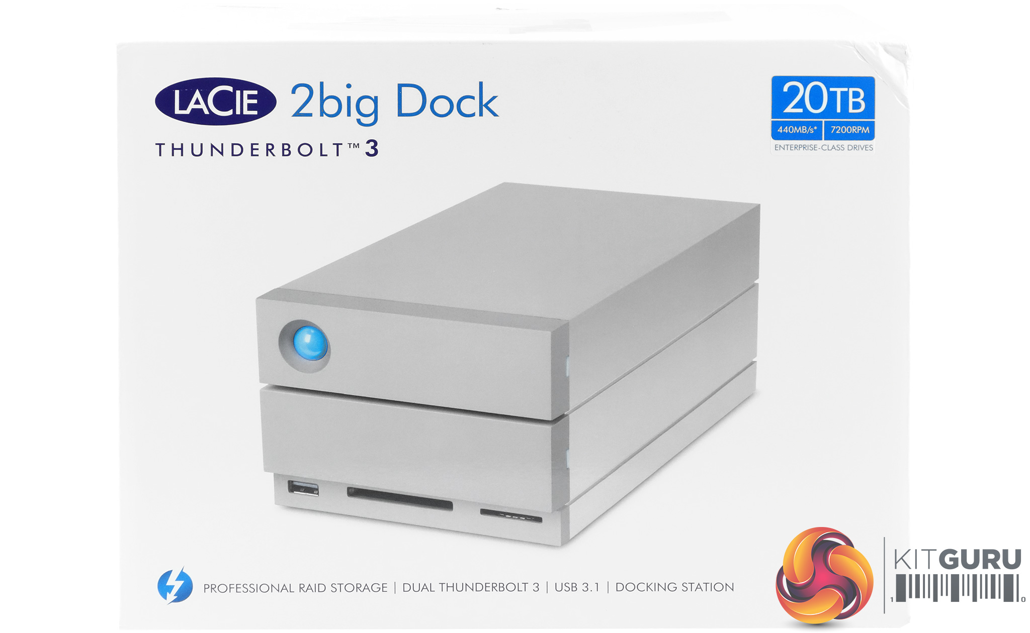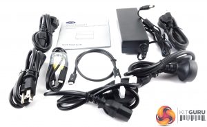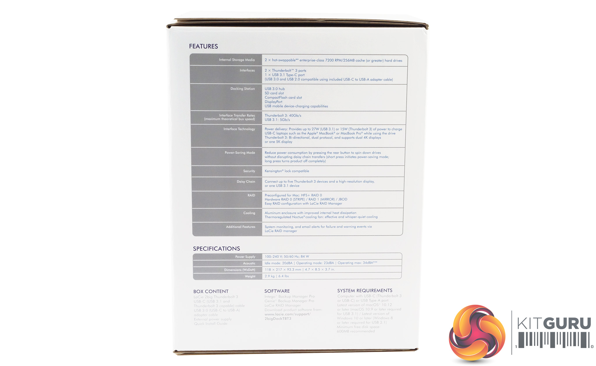 As usual with a LaCie drive, the box bundle contains most of the power leads known to man. Along with these are an 84W power adapter (Hoioto ADS-110DL-12-1), Thunderbolt 3 cable (which is rather short), a USB Type-C to Type-A cable and a manual.