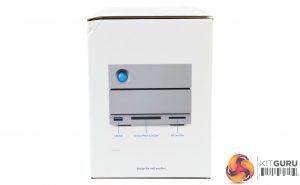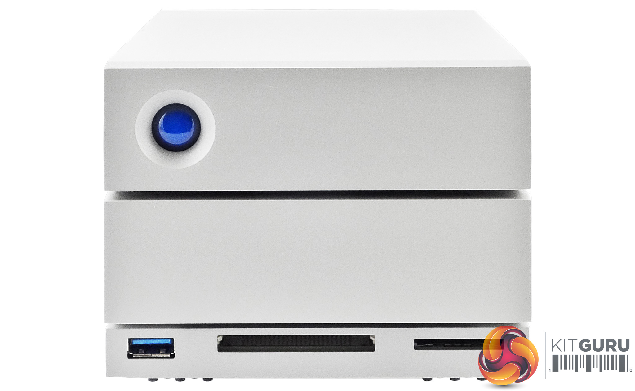 The front of the unit is basically made up by the two drive doors, the top one of which has the usual LaCie Blue LED indicator ‘orb' which turns from its usual Blue to Red if any drastic happens to the system. Under the drive doors is a single USB 3.0 port along with CompactFlash and SecureDigital slots.