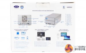 The box front has a very large, clear image of the unit along with a small panel in the top right hand corner which shows the units capacity, stated transfer speed, hard disk speed and the fact they are enterprise class drives. The rear of the box has a image of the rear of the unit and a 3/4 view of the front with all the relevant features clearly labelled.