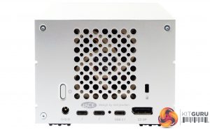 Sitting under the grill are the power input port, the two Thunderbolt 3 ports, a USB 3.1 Type-C port and a DisplayPort. Positioned between the Thunderbolt and USB ports is a firmware update button that only works for USB firmware updates.