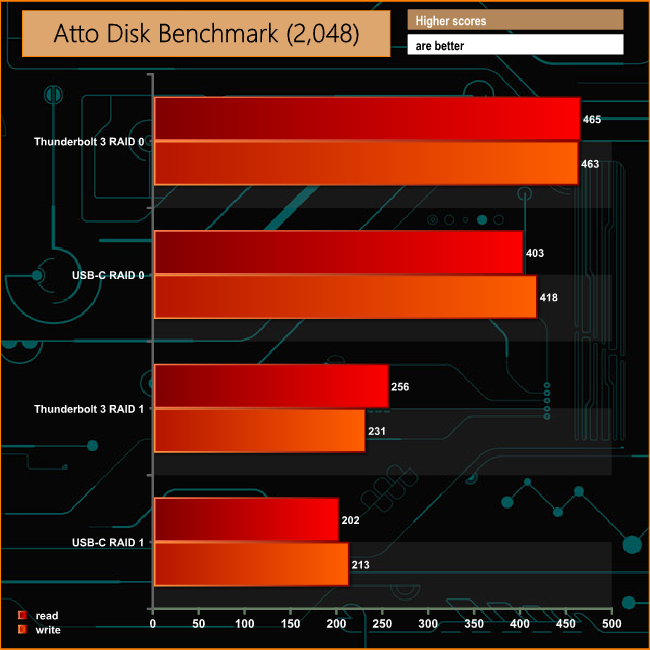 LaCie quote a official maximum transfer rate for the 2big Dock of 440MB/s when using a Thunderbolt 3 connection, which we able to confirm and indeed better with the ATTO benchmark. The review unit producing read/write scores of 465MB/s and 463MB/s respectively.