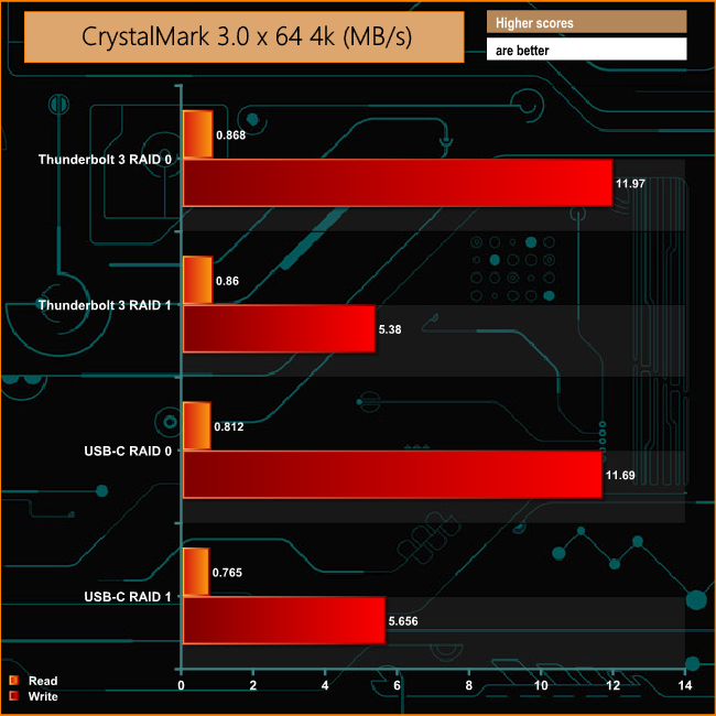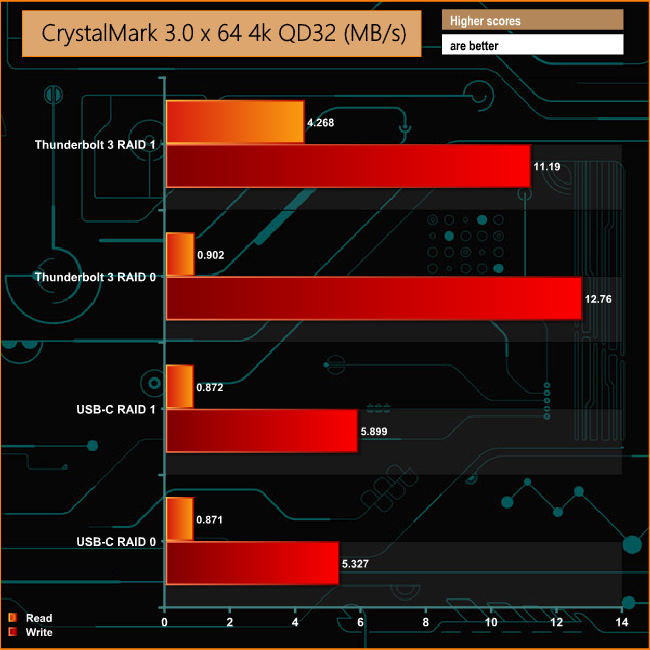 The write performance of the 2big Dock Thunderbolt 3 is far superior to the reads in both arrays when it comes to dealing with 4K file sizes. The read performance does pick up significantly at a deeper queue depth when in a RAID 1 array using the Thunderbolt 3 interface.