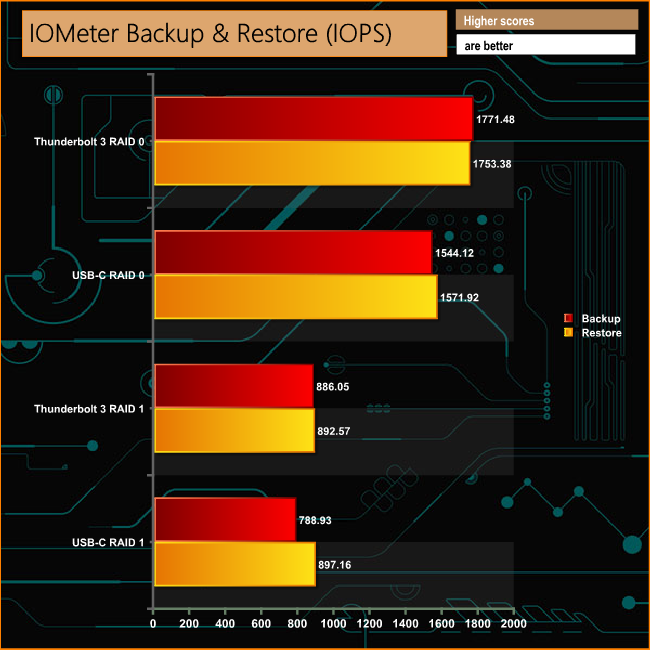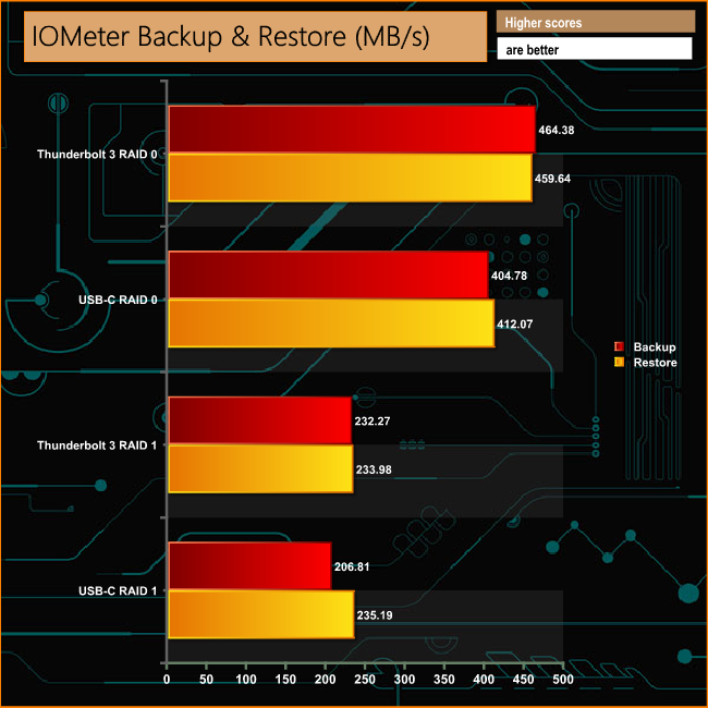 The 2big Dock had no problems dealing with backing and restoring the 100GB file test file, writing to the drive at 464MB/s and reading the data back at 459MB/s using the Thunderbolt 3 interface with the disks in a RAID 0 array.