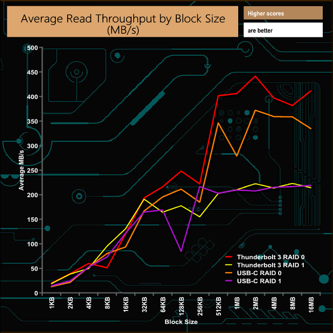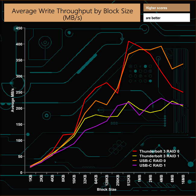 Peak throughput for the drive when using Thunderbolt 3 comes when it is in a RAID 0 array at the 2MB block size when the drive hits 441.39MB/s before falling back before hitting 411.43MB/s at the end of the test. Peak read performance in RAID 1 was at the 8MB block size with the drive reaching 222.91MB/s.