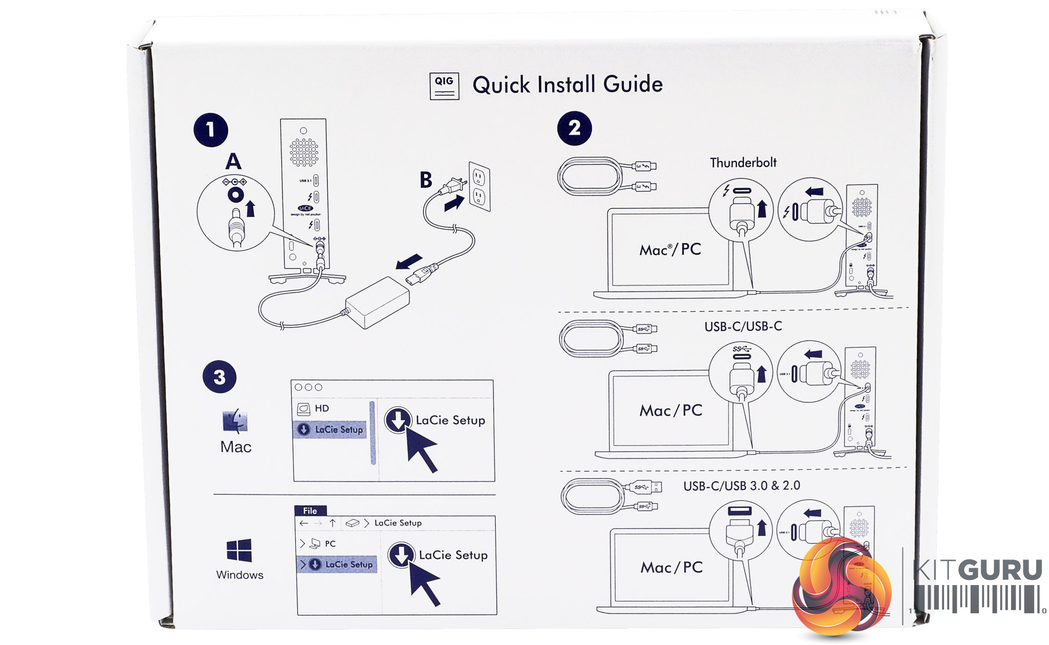 The outside of the accessory box has an illustrated quick start guide showing how the d2 drive can be connected while inside the box there seems to be every mains connector known to man to connect to the 60W power adapter to any national grid, a USB-C cable and finally a Thunderbolt cable.