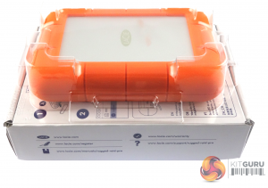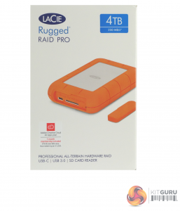 The box the Rugged RAID PRO comes in has a good clear image of the drive showing the USB-C connection and the UHS-II SD card reader. A label on the top right of the box displays the drive’s capacity. The rear of the box has another view of the drive pointing out its features and multilingual notes about performance and its RAID 0/1 support.