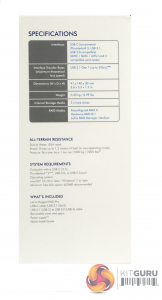 One side of the box has a list of the drives specifications, its protection features, system requirements and finally what's included in the box. The other side of the box has a full-size side profile of the drive on it.