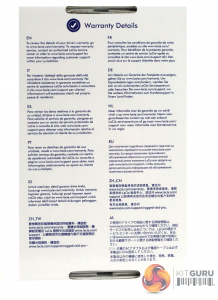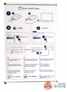 The drive is protected in transit by a clear plastic shell which sits on top of a cardboard inner box that not only holds all the accessories for the drive; power adapter, four plug heads (UK, US/Canada, EU and AU), USB-C and USB-C to USB 3.0 Type-A cables and a spare port cover, but also but also has useful diagrams on the front to show how to hook the drive up. The back of the box is covered by multilingual warranty information on the back.