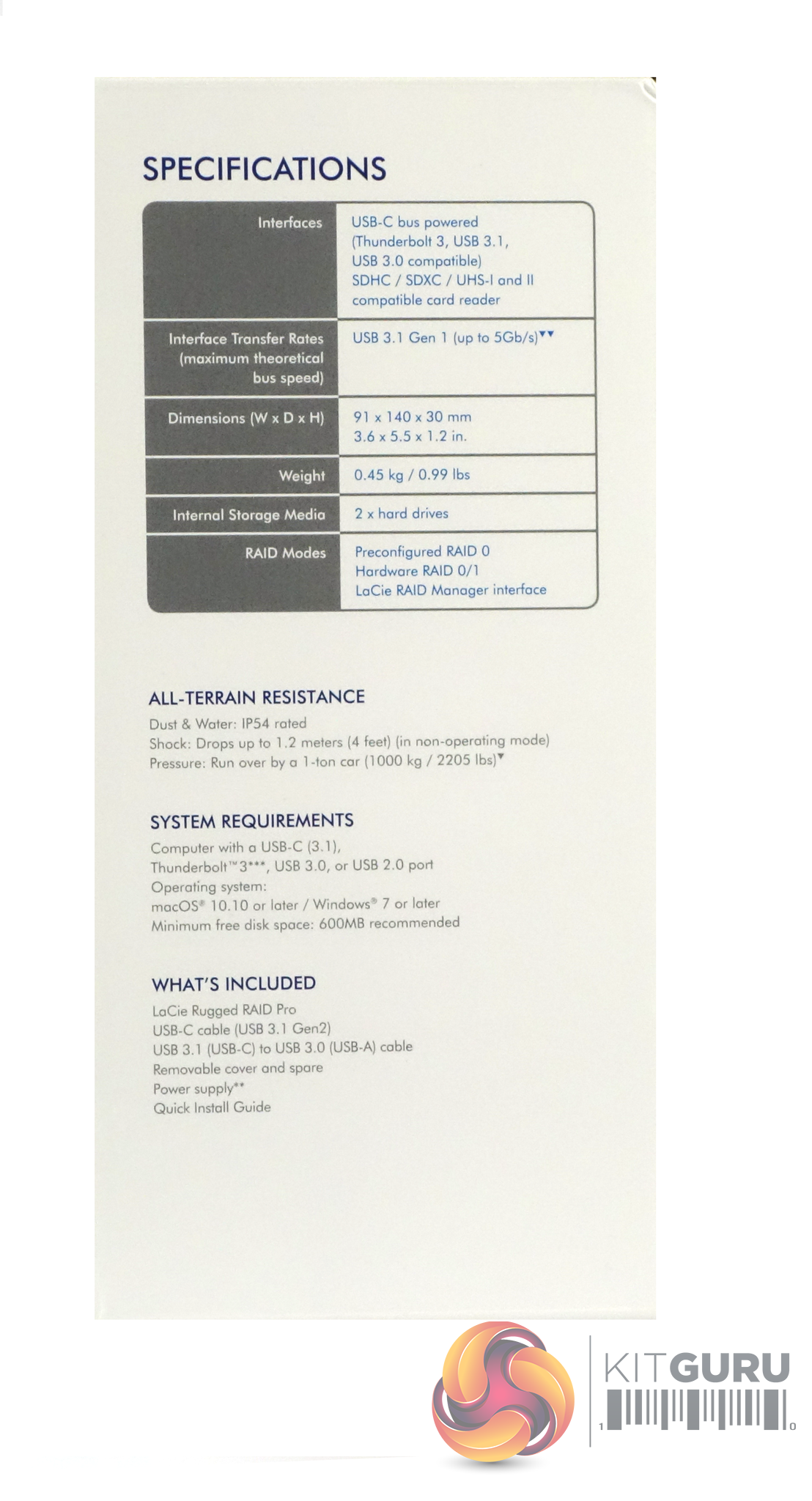 The box the Rugged RAID PRO comes in has a good clear image of the drive showing the USB-C connection and the UHS-II SD card reader. A label on the top right of the box displays the drive’s capacity. The rear of the box has another view of the drive pointing out its features and multilingual notes about performance and its RAID 0/1 support.