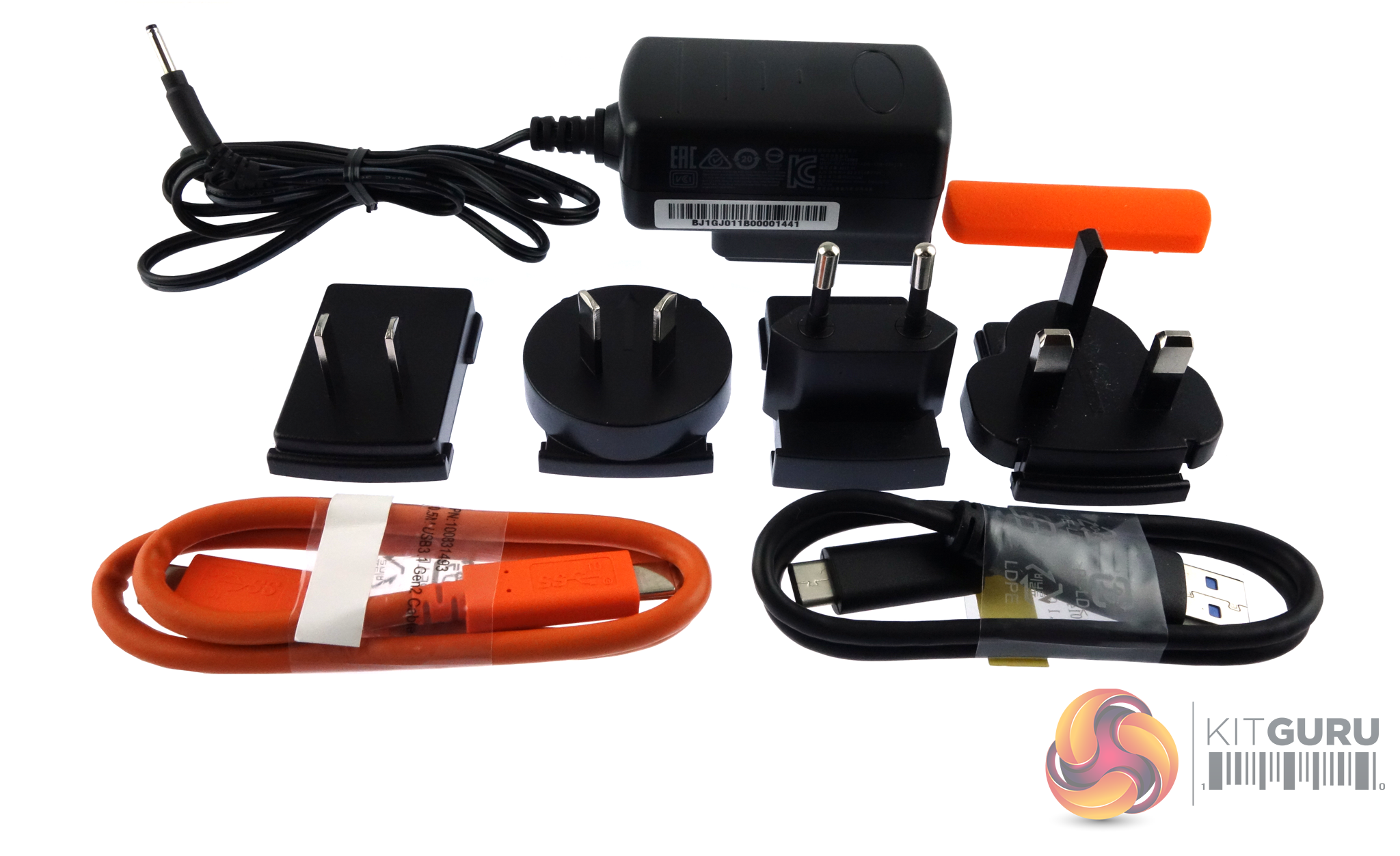 The drive is protected in transit by a clear plastic shell which sits on top of a cardboard inner box that not only holds all the accessories for the drive; power adapter, four plug heads (UK, US/Canada, EU and AU), USB-C and USB-C to USB 3.0 Type-A cables and a spare port cover, but also but also has useful diagrams on the front to show how to hook the drive up. The back of the box is covered by multilingual warranty information on the back.