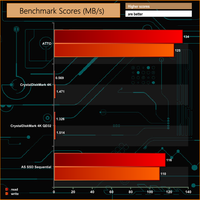 AS SSD is a great free tool designed just for benching Solid State Drives. It performs an array of sequential read and write tests, as well as random read and write tests with sequential access times over a portion of the drive. AS SSD includes a sub suite of benchmarks with various file pattern algorithms but this is difficult in trying to judge accurate performance figures.
