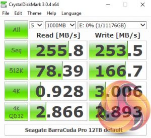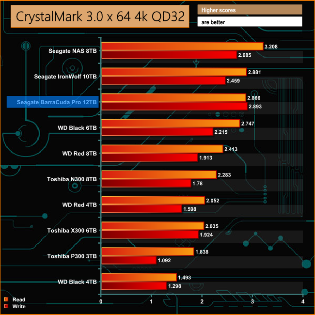Although the read performance of the 12TB BarraCuda Pro is a little lower than the 10TB IronWolf when it comes to reading small data at largish queue depths, it does swing back to the BarraCuda Pro when it comes to writes.