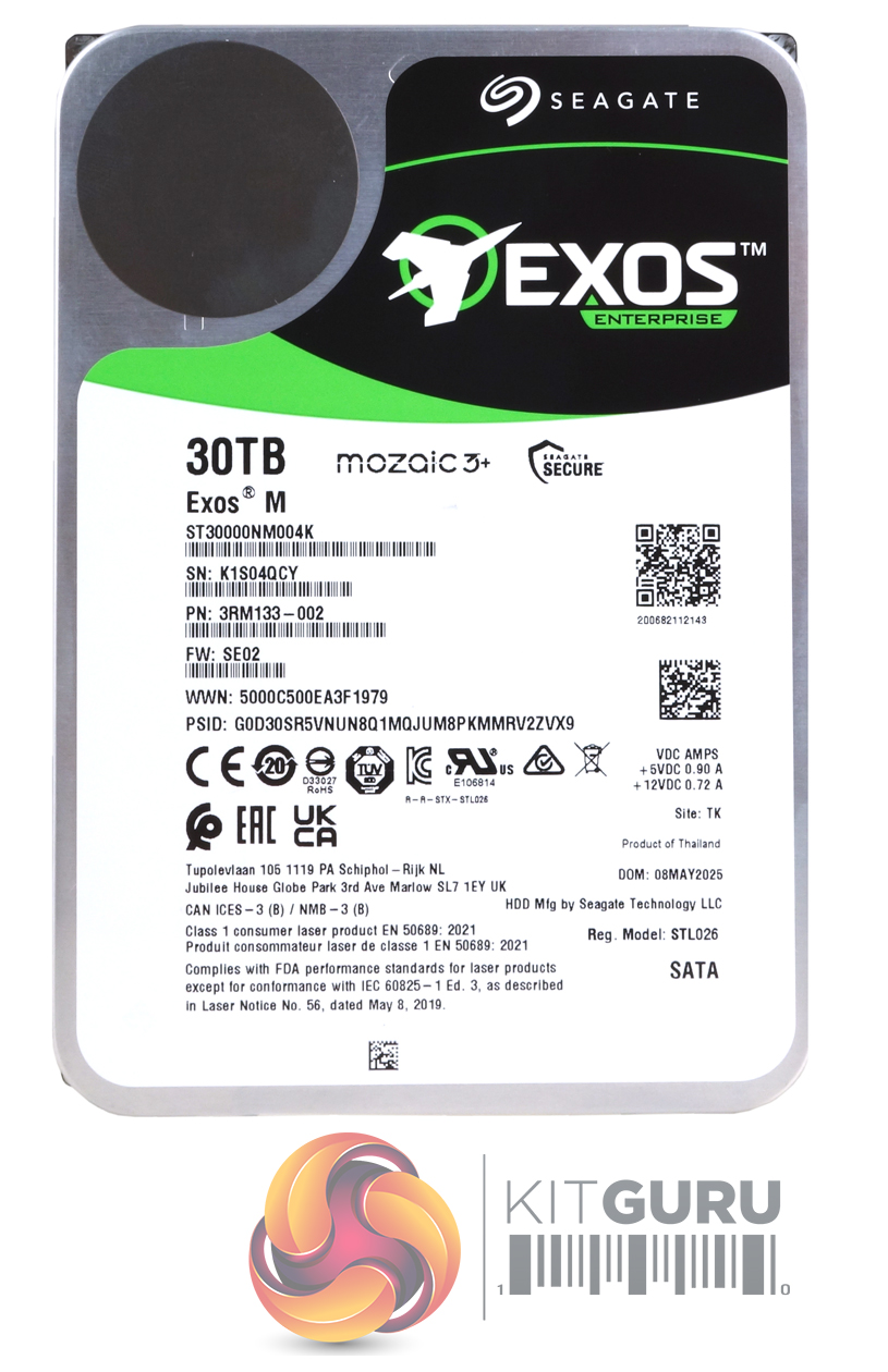 Seagate's Exos M is built on a standard 3.5-inch format with a 26.11mm height. The drive uses Helium technology, allowing Seagate to use ten 3TB platters and 20 heads in the enclosure. The drive has a spindle speed of 7,200rpm and there is 512MB of cache.