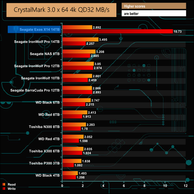The Exos X14 uses Advanced Write Caching technology which employs enhanced algorithms to provide a very large boost to the random write performance of the drive as can be clearly seen in the CrystalDiskMark write result.