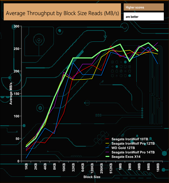 In our throughput test, reads peak at the 8MB block size at 262MB/s before falling back to end the test at 244MB/s. Writes peak at 272MB/s as the drive passes through the 256KB block size, before dropping back to finish the test at 231MB/s. Both of these peak figures confirm the official Seagate transfer rate for the drive of 261MB/s.