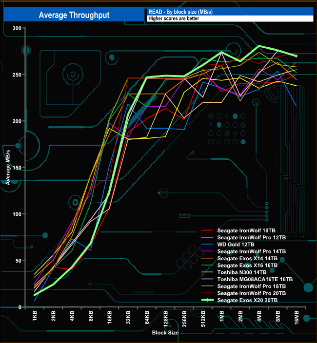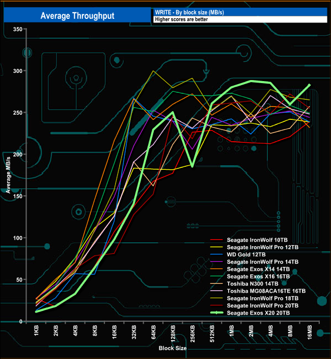 In the write throughput test, the Exos X20 peaked at the 2MB block mark at 287.55MB/s before dropping back slightly to finish the test run at 282.61MB/s.