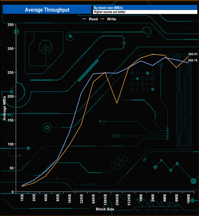 In the read throughput test, the drive peaked at the 4MB block mark at 280MB/s before dropping back to finish the test run at 269MB/s.