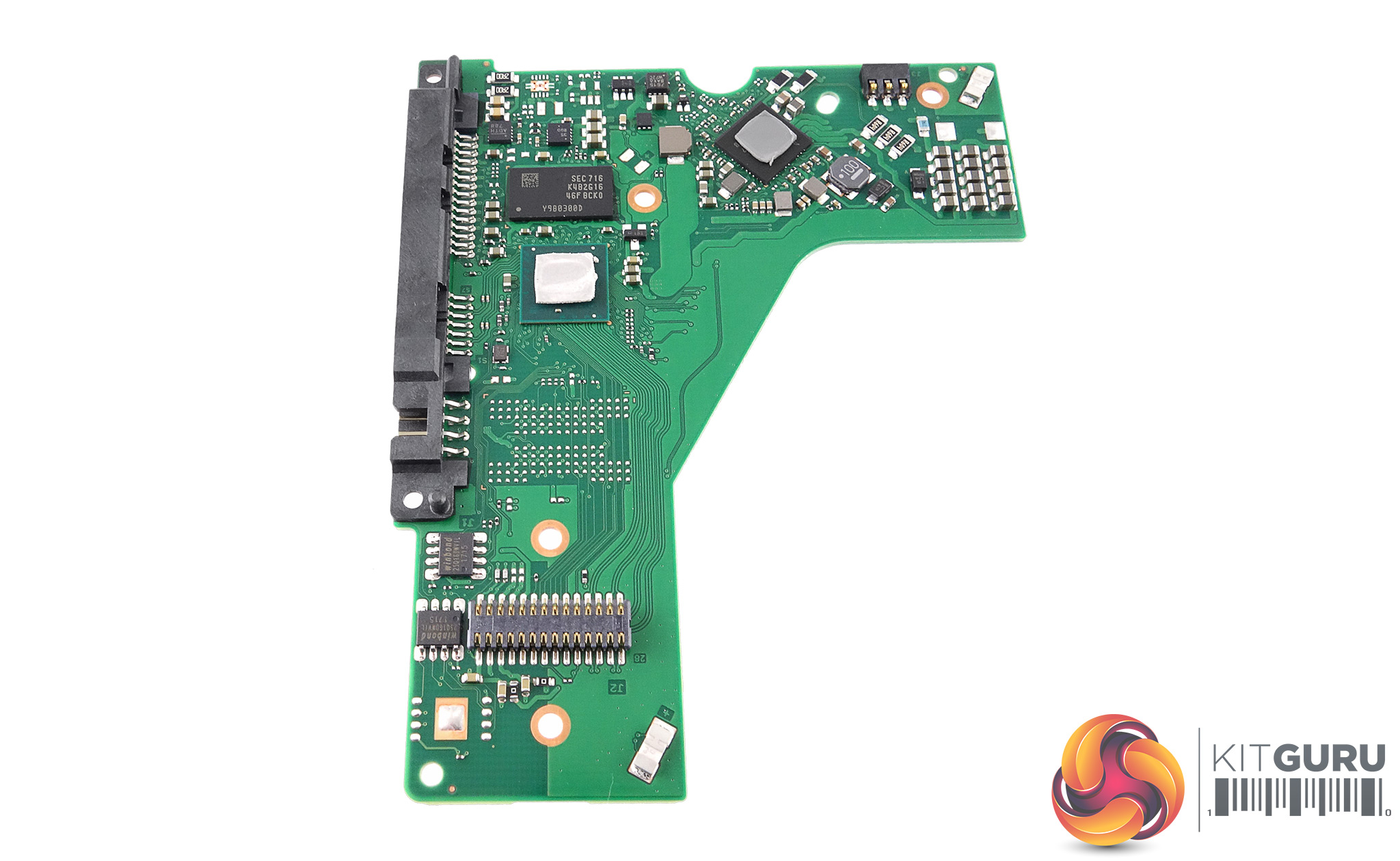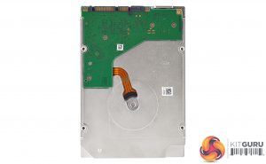 A quick look at the flip side of the PCB reveals a Samsung K4B2G1646F BCKO DDR3-1600 cache IC, a Avago DS01 disk controller and a Smooth 78001 v5 motor controller. The two angled silver units at the ends of the PCB are the rotational Vibration (RV) sensors.