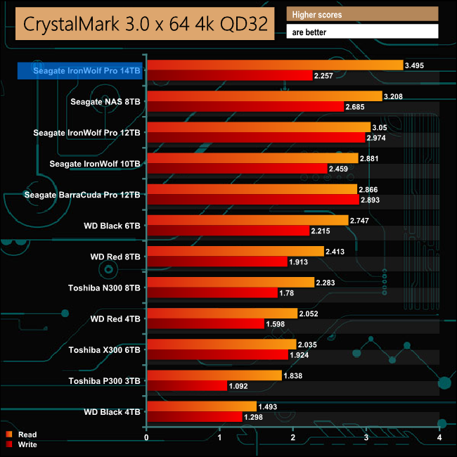 The 14TB Seagate IronWolf Pro produced the fastest read score of any mechanical hard drive we have seen to date in CrystalDiskMark. Its write performance isn't as impressive though, falling short of the write performance of the previous 12TB flagship of the IronWolf Pro range.
