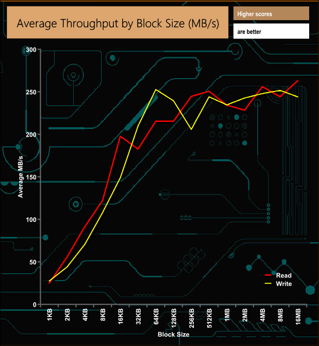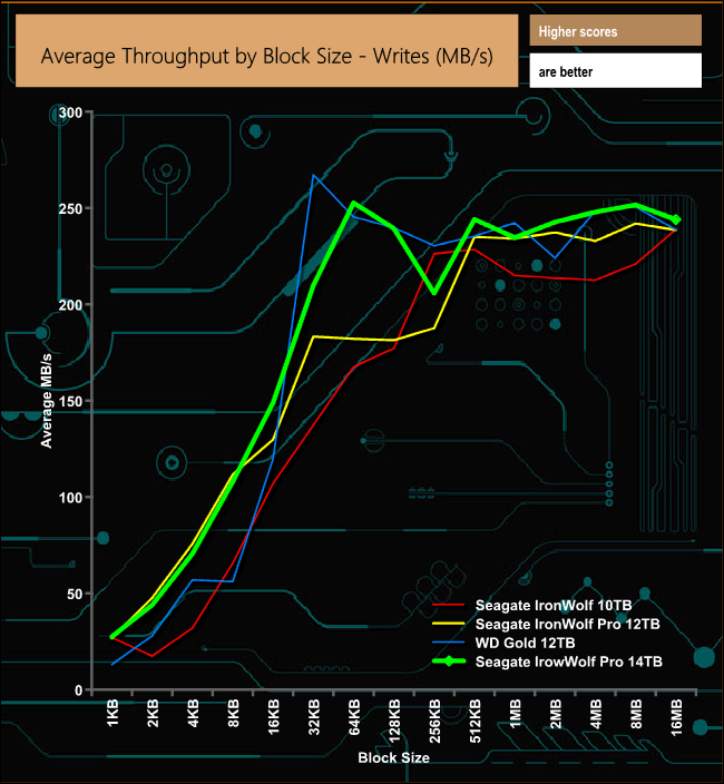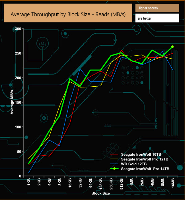 The 14TB IronWolf Pro drive is the fastest mechanical drive we've seen to date in our throughput test with a read score of 263MB/s and 251MB/s for writes.